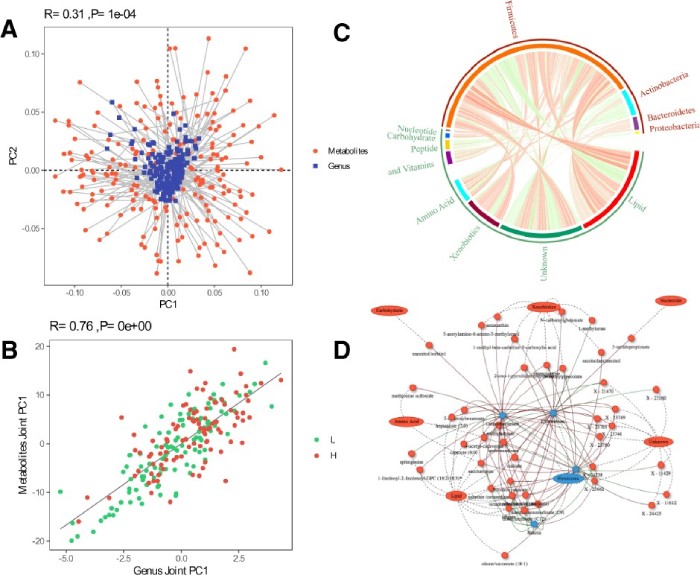 (A) Procrustes analysis (PA):連接兩點(diǎn)的線的長(zhǎng)度表示兩個(gè)數(shù)據(jù)集之間樣本的一致性。(B) O2PLS模型:O2PLS模型中具有較大的荷載值,被認(rèn)為是它們相似性的重要因素。(C) 微生物和代謝物之間的spearman相關(guān)性的Circos圖。(D) 不同的代謝物和屬于韌皮部的微生物之間的spearman相關(guān)網(wǎng)絡(luò)。