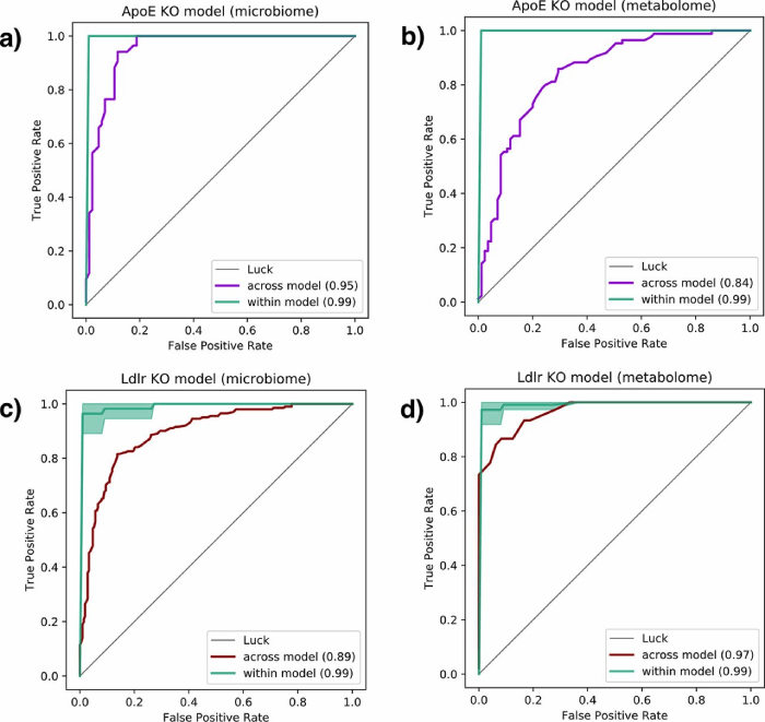 綠色曲線代表每個(gè)小鼠模型內(nèi)的分類準(zhǔn)確性。紫色ROC曲線對(duì)應(yīng)于使用來(lái)自ApoE-/-小鼠模型的腸道微生物組(a)和代謝組(b)數(shù)據(jù)訓(xùn)練的模型,以預(yù)測(cè)Ldlr-/-小鼠的IHH暴露。紅色曲線顯示的是在ApoE-/-小鼠上測(cè)試的Ldlr-/-小鼠的微生物組(c)和代謝組(d)數(shù)據(jù)。IHH:間歇性低氧和高碳酸血癥。