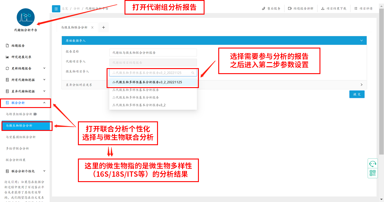 首先,我們進(jìn)入百邁客云平臺(tái),打開代謝組分析結(jié)題報(bào)告,在報(bào)告左側(cè)找到聯(lián)合分析模塊,然后選擇與微生物聯(lián)合分析個(gè)性化,再在右側(cè)選擇需要參與分析的微生物報(bào)告,之后進(jìn)入第二步參數(shù)設(shè)置,示例圖如下: