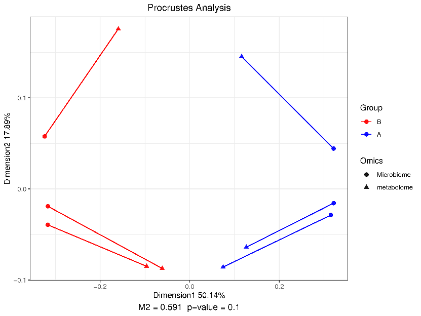 由于兩組數(shù)據(jù)集的屬性不同,并不適合用來(lái)直接比較,可分別對(duì)兩個(gè)數(shù)據(jù)集降維排序分析,并提取特征軸的坐標(biāo)。本分析選用 PCoA 分別對(duì)微生物組(屬水平)和代謝組進(jìn)行降維排序,之后進(jìn)行Procrustes分析,比較微生物組與代謝組之間的相似和變異情況。