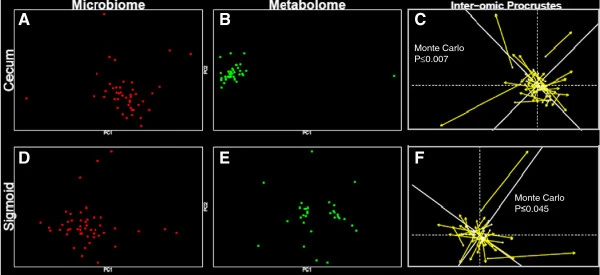 圖注:Procrustes分析:第一列圖表包含微生物組數(shù)據(jù)(紅點(diǎn)),第二列包含代謝組數(shù)據(jù)(綠點(diǎn))。第一行包含盲腸數(shù)據(jù),第二行包含乙狀結(jié)腸數(shù)據(jù)。對(duì)盲腸微生物組(A)、盲腸代謝組(B)、乙狀結(jié)腸微生物組(D)和乙狀結(jié)腸代謝組(E)進(jìn)行主成分分析。然后進(jìn)行樣本點(diǎn)間(C和F) Procrustes分析。Procrustes圖上的線越長(zhǎng),表明微生物組和代謝組的對(duì)象內(nèi)差異越大。所示的顯著性值是使用Vegan R軟件包中的protest函數(shù)計(jì)算的,該函數(shù)進(jìn)行重復(fù)的對(duì)稱Procrustes分析以估計(jì)顯著性。