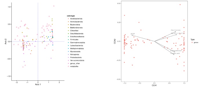 右圖注:圖中的點(diǎn)表示微生物,箭頭為代謝物(為了更清晰的展示代謝物,根據(jù)圖幅,統(tǒng)一將箭頭的長(zhǎng)度進(jìn)行了一定比例的縮放),僅展示箭頭長(zhǎng)度top5 的代謝物名稱。微生物和原點(diǎn)連線與箭頭形成的夾角反映了代謝物和微生物之間的相關(guān)性,銳角為正相關(guān),鈍角為負(fù)相關(guān),直角為不相關(guān)。