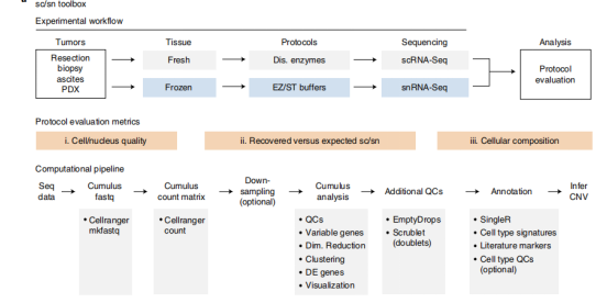 a.?建立了系統(tǒng)性的scRNA-Seq和snRNA-Seq的實驗流程和數(shù)據(jù)分析流程