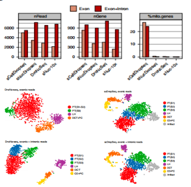 snRNA-seq將內(nèi)含子和外顯子數(shù)據(jù)同時分析時,平均的reads、genes?和scRNA-seq相對一致;但是scRNA-seq的線粒體基因比例高達24%;將線粒體的基因過濾之后,3種snRNA-seq檢測基因的能力均高于scRNA-seq;選擇1469個上皮細胞進行tSNE 降維可視化分析,如果將外顯子和內(nèi)含子數(shù)據(jù)同時進行分析,可以將DroNc-seq的細胞類型增加到6個,但是?scDropSeq 的細胞類型沒有增加;雖然多了一個細胞簇,但是該簇主要表達解離時誘導(dǎo)的壓力響應(yīng)基因(圖3-1)。
