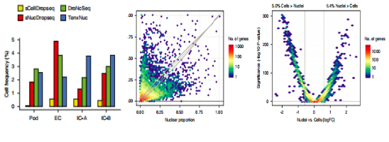 將4種方法的數(shù)據(jù)整合分析,共鑒定了13個細胞簇,包括足細胞,內(nèi)皮細胞和腎小球膜細胞;3種snRNA-seq 檢測足細胞,內(nèi)皮細胞和閏細胞的靈敏度更高;但是scRNA-seq未檢測到任何足細胞。差異基因表達分析顯示,?71.4%?基因在細胞和細胞核中都被檢測到;在檢測到的基因中,僅僅?5.0%?在細胞中的表達量高于細胞核,6.4%的基因在細胞核中的表達量高于細胞(fold change>1.5,?P value <0.05)(圖3-2);scRNA-seq高表達基因包括線粒體、核糖體基因和熱休克途徑中的基因;snRNA-seq高表達基因包括溶質(zhì)載體、轉(zhuǎn)錄因子和Non-coding?RNA基因。