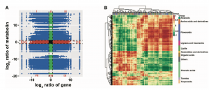 最后,為了進(jìn)一步準(zhǔn)確了解成熟果實(shí)中轉(zhuǎn)錄水平與代謝物變化之間的關(guān)系,作者進(jìn)行了DEGs與DAMs之間的相關(guān)分析,其中,變化趨勢相同的DEGs和DAMs主要涉及類黃酮、酚酸類、氨基酸及其衍生物、萜類、有機(jī)酸、脂類等(圖7)。