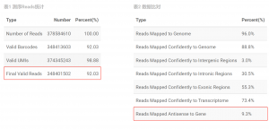 (1)數(shù)據(jù)相關(guān)統(tǒng)計(jì):新增有效reads數(shù)及占比、基因反義鏈比對率