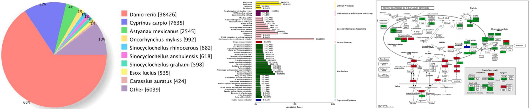用RNA-seq技術(shù)研究氨脅迫下鯉魚(yú)肝胰腺的基因表達(dá)譜,共有3367個(gè)單基因被鑒定為與氨脅迫相關(guān)的差異表達(dá)基因(DEG)。1724DEG下調(diào),1643DEG上調(diào)。KEGG分析將這些DEG的代謝