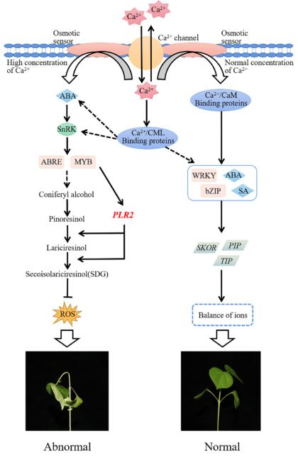 當(dāng)Ca2+從細(xì)胞外或液泡涌入細(xì)胞質(zhì)時,細(xì)胞質(zhì)中的Ca2+濃度會增加,Ca2+會與一些Ca2+受體蛋白CaM和CML結(jié)合,形成Ca2+/CaM(CML)結(jié)合蛋白。激活的Ca2+信號導(dǎo)致一些下游轉(zhuǎn)錄因子的表達(dá)增加,如WRKY和bZIP,通過調(diào)節(jié)細(xì)胞內(nèi)外水和離子的平衡,細(xì)胞在傳遞Ca2+信號后可以迅速恢復(fù)到低濃度Ca2+環(huán)境的狀態(tài)。同時,一些激素也受Ca2+信號的調(diào)節(jié),如ABA和SA,可以緩解棉花中的Ca2+瞬變。當(dāng)植物暴露于高濃度的Ca2+時,它們再也不能抵抗單獨由通道蛋白引起的大量Ca2+造成的損害。R將通過ROS清除機(jī)制與通道蛋白形成復(fù)雜的調(diào)節(jié)網(wǎng)絡(luò),共同緩解高Ca2+應(yīng)激。滲透受體感應(yīng)到Ca2+的增加,然后調(diào)節(jié)ABA的合成,激活A(yù)BA信號通路。首先,增加的ABA與PYL蛋白結(jié)合并與PP2C相互作用,通過SnRK促進(jìn)一些下游因子的磷酸化,并啟動ABA信號反應(yīng)。此時,編碼PLR2的轉(zhuǎn)錄因子ABRE和MYB被激活。然后,通過促進(jìn)松脂醇合成落葉松烯醇,落葉松烯醇合成SDG,從而提高活性氧的清除能力,從而增強(qiáng)棉花抵御高Ca2+脅迫的能力(圖4)。