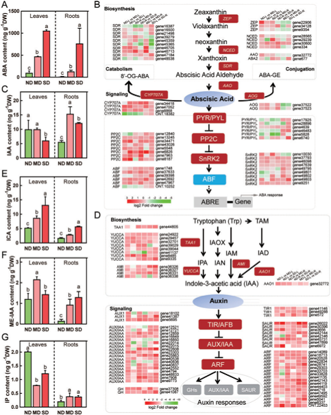樣品做了三組處理:干旱處理0天(ND stress)、5天(MD stress)和10天(SD stress),并對(duì)光合作用進(jìn)行了檢測(cè),同時(shí)檢測(cè)了脫落酸(ABA)和生長(zhǎng)素(auxin)的含量。