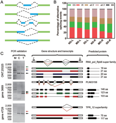 RNA-Seq檢測(cè)到的轉(zhuǎn)錄本與R.chinensis ‘Old Blush’基因組進(jìn)行比對(duì),鑒定剪接異構(gòu)體。如圖7 A所示,我們從非冗余轉(zhuǎn)錄本中檢測(cè)到42,544個(gè)可變剪接(As),包括12,096個(gè)內(nèi)含子保留(IRs)、12,914個(gè)選擇性3’剪接位點(diǎn)(alt 3’)、7,433個(gè)選擇性5’剪接位點(diǎn)(alt 5’)、9,406個(gè)外顯子跳過(guò)(ES)和695個(gè)互斥外顯子(ME)(圖7 A)。IR在玫瑰葉片中最為常見(jiàn),在ND-L、MD-L、SD-L和ND-R樣品中的比例分別占34.77%、30.83%、30.1%和29.56%。而在SD脅迫下,ES是主要的AS模式(占所有AS事件的32.16%)。在MD-R中最常見(jiàn)的AS事件是alt 3’ (32.38%), ME(1.75%)是最罕見(jiàn)的(圖7 B)。為了進(jìn)一步驗(yàn)證新發(fā)現(xiàn)的轉(zhuǎn)錄組剪接異構(gòu)體,我們隨機(jī)選擇了三個(gè)至少注釋到兩個(gè)異構(gòu)體上的基因(ONT.25325、gene 3669和gene 4728)進(jìn)行RT- PCR驗(yàn)證。在這些基因的第一個(gè)外顯子和最后一個(gè)外顯子或適當(dāng)區(qū)域設(shè)計(jì)引物。如圖7 C所示,片段的條帶大小與轉(zhuǎn)錄組數(shù)據(jù)中發(fā)現(xiàn)的剪接亞型的條帶大小一致。對(duì)推測(cè)的剪接異構(gòu)體進(jìn)行克隆、測(cè)序和比對(duì),以驗(yàn)證剪接連接。例如,ONT. 25325編碼了一個(gè)putative protein,呈現(xiàn)出4個(gè)剪接亞型(圖7C),并隨后得到證實(shí)。此外,gene 3669和gene 4728顯示出相同的剪接變異。此外,一些剪接異構(gòu)體,如gene 3669,在對(duì)照和干旱脅迫下表現(xiàn)出差異。新的可變剪接體的鑒定進(jìn)一步注釋了R.chinensis ‘Old Blush’基因組。