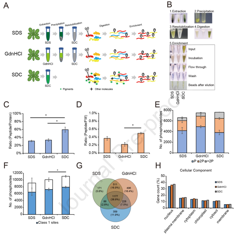 從植物組織中高效提取蛋白質(zhì)是深入分析植物蛋白質(zhì)組和磷酸化蛋白質(zhì)組的第一步和關(guān)鍵一步。為此,作者比較了SDS、GdnHCl和SDC等不同變性劑對(duì)擬南芥葉片中蛋白質(zhì)的提取性能。結(jié)果發(fā)現(xiàn)SDS-和SDC-提取的蛋白的性能相似,但優(yōu)于GdnHCl。植物樣品相較于動(dòng)物樣品含有較低濃度的蛋白質(zhì),因此作者優(yōu)化了磷酸化蛋白質(zhì)組的提取和富集的方法,即用SDS或GdnHCl緩沖液提取的蛋白質(zhì)樣品,在蛋白質(zhì)消化和隨后的磷酸肽富集之前,必須去除變性劑(圖1A)。接著用氯仿-甲醇沉淀提取的樣品,去除變性劑和其他干擾生物分子(圖1A和1B)。而作者通過(guò)實(shí)驗(yàn)發(fā)現(xiàn),SDC法提取的蛋白樣本不需要經(jīng)過(guò)氯仿-甲醇沉淀,而鑒定到的磷酸化蛋白更多,同時(shí)需要的植物材料更少。因此作者認(rèn)為SDC法更節(jié)省成本達(dá)到更好的效果,并在番茄、水稻、綠藻等生物中得到驗(yàn)證,從而確定了磷酸化蛋白組學(xué)的方法,稱之為GreenPhos。