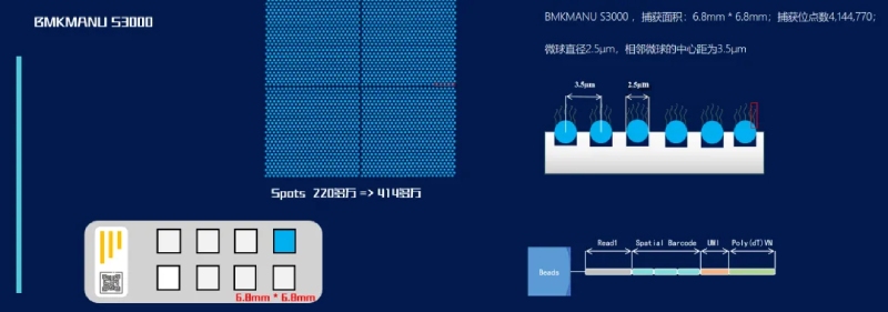 發(fā)布會中,百邁客生物智能制造副總裁劉敏對百創(chuàng)S3000空間轉(zhuǎn)錄芯片的性能進(jìn)行了詳細(xì)介紹。百創(chuàng)S3000在6.8mm*6.8mm的捕獲區(qū)域內(nèi)鋪設(shè)了4,144,770個(gè)捕獲位點(diǎn),相鄰兩個(gè)捕獲位點(diǎn)的中心距為3.5μm。相較于現(xiàn)在廣受市場認(rèn)可與好評的百創(chuàng)S1000轉(zhuǎn)錄組芯片,捕獲位點(diǎn)數(shù)提升近2倍,分辨率同樣提升近2倍。