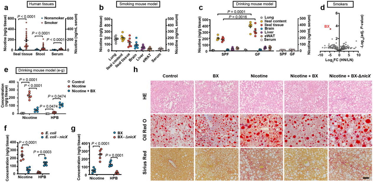 該研究發(fā)現(xiàn)尼古丁在吸煙期間在腸道中積聚并加速NAFLD的進(jìn)展,但它可以被人類共生菌B.xylansolvens有效降解。揭示了了腸道尼古丁積累的病理影響,并確定了一種內(nèi)源性尼古丁降解腸道細(xì)菌,該細(xì)菌對預(yù)防和治療吸煙者的NASH具有潛在價值。