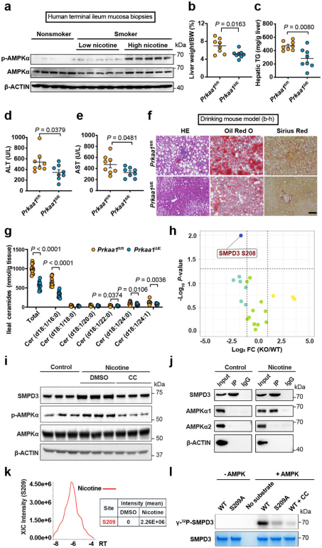 圖2-尼古丁誘導(dǎo)的NAFLD進(jìn)展中腸AMPKa-SMPD3軸的激活