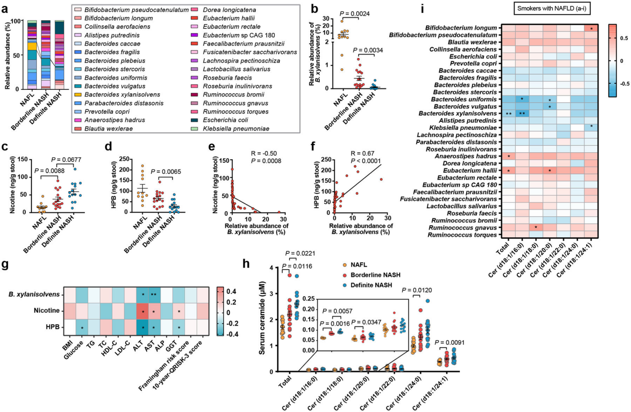 收集了83名經(jīng)活檢診斷為NAFLD患者的微生物數(shù)據(jù),將患者分為吸煙者(n=41)和非吸煙者(n=42)。這B.xylansolvens介導(dǎo)的尼古丁降解可能保護(hù)吸煙者的肝功能。NASH患者的血清神經(jīng)酰胺水平,尤其是主要來自腸道的神經(jīng)酰胺(D18:1/16:0)水平顯著高于NAFL患者(圖4h),并與B.xylansolvens的豐度呈負(fù)相關(guān)(圖4l)。綜上所述,腸道尼古丁蓄積是吸煙者臨床NAFLD進(jìn)展的危險因素,同時也表明具有尼古丁降解活性的B.xylansolvens具有保護(hù)作用。