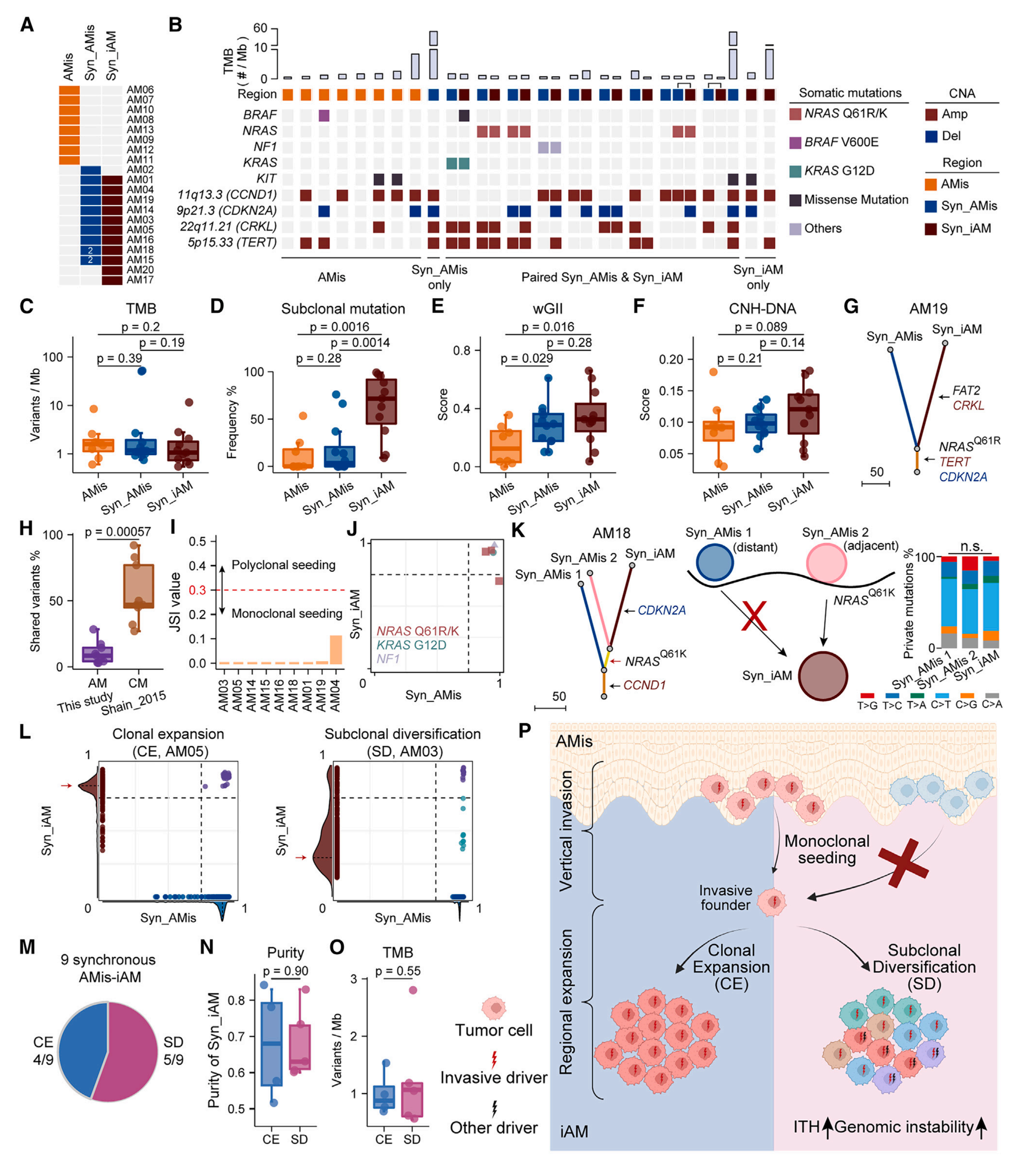 本文利用LCM技術(shù)探討患者內(nèi)部垂直侵襲和區(qū)域擴(kuò)張的進(jìn)化動(dòng)態(tài)。首先比較了AMis、Syn_AMis和Syn_iAM三種不同類型病變的基因組圖譜,在5例表現(xiàn)出侵襲驅(qū)動(dòng)基因的患者中發(fā)現(xiàn)配對(duì)的Syn-AMis和Syn-iAM共有突變,但是在純AMis中沒有檢測(cè)到。這個(gè)結(jié)果表明在垂直侵襲之前就已經(jīng)獲得了侵襲驅(qū)動(dòng)突變,進(jìn)一步證實(shí)了它們?cè)贏M侵襲中的驅(qū)動(dòng)作用,這些結(jié)果也證實(shí)之前提到的基因組不穩(wěn)定性有助于AM侵襲。進(jìn)一步探索垂直侵襲起源,研究結(jié)果表明,在垂直侵襲階段,AMis在演化早期獲得驅(qū)動(dòng)突變并迅速穿過基底膜,以單克隆播散到真皮中。