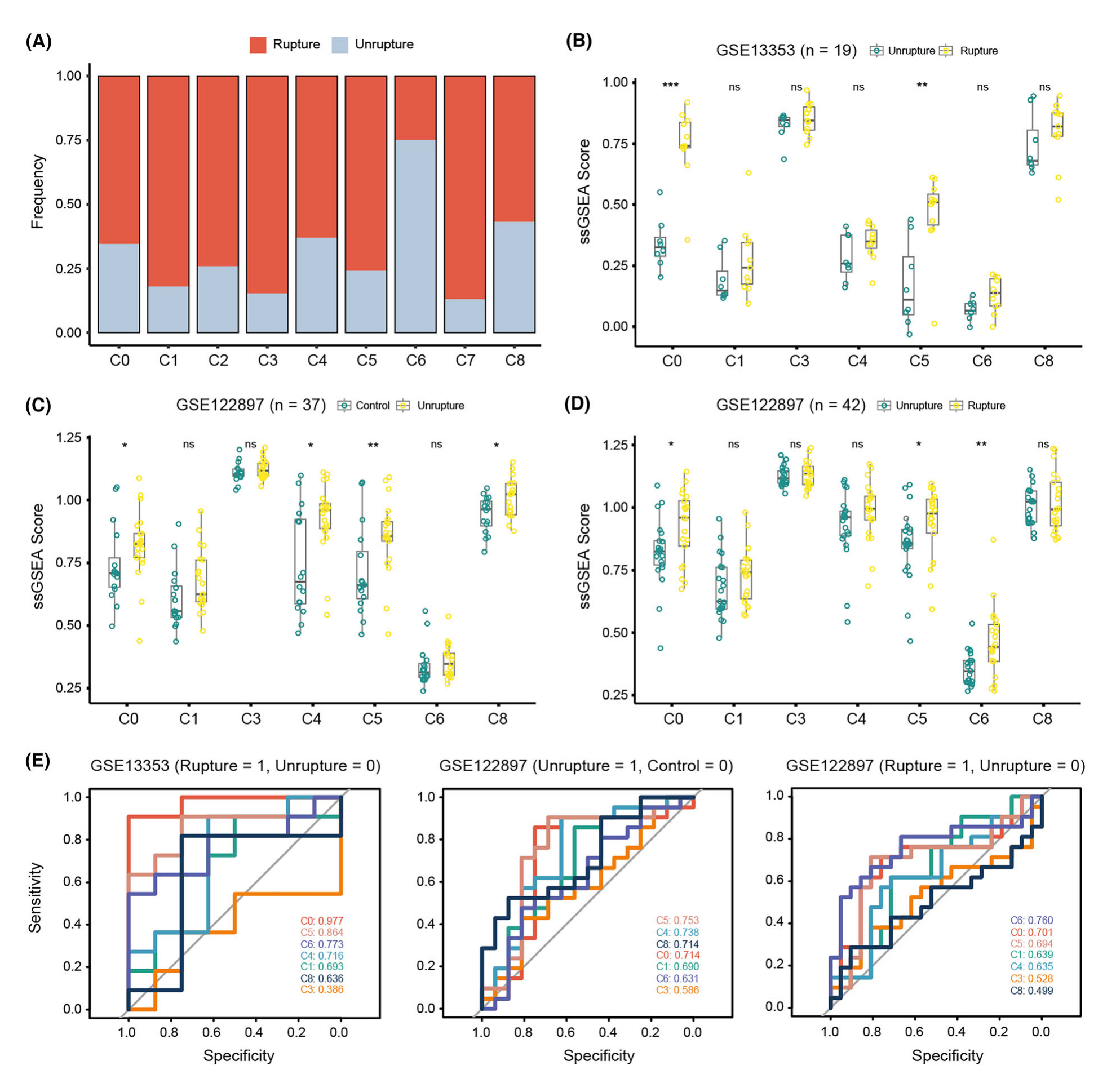 為了研究中性粒細(xì)胞浸潤的病理意義,該研究首先展示了破裂和未破裂樣本中每種類型的中性粒細(xì)胞的比例。破裂樣本中除 C6 之外的中性粒細(xì)胞亞群有所增加(圖5A)。該研究進(jìn)一步整理了這些中性粒細(xì)胞的基因特征,發(fā)現(xiàn)C0和C5在破裂的IA組織中顯著富集(圖5B,D)。此外,與正常血管組織相比,未破裂 IA 中的 C0 和 C5 也顯著富集,與 C4 和 C8 相同(圖5C),表明中性粒細(xì)胞參與 IA 形成和破裂。接下來,進(jìn)行 ROC 分析以評(píng)估中性粒細(xì)胞亞群與 IA 形成和破裂之間的關(guān)聯(lián)。結(jié)果顯示C0和C6的ssGSEA評(píng)分在預(yù)測(cè)IA破裂方面產(chǎn)生了令人滿意的AUC值(兩個(gè)數(shù)據(jù)集中的AUC?>?0.7)(圖5E),表明這些細(xì)胞可能參與IA破裂。反過來,C4 和 C5 在預(yù)測(cè) IA 形成方面表現(xiàn)良好。在此基礎(chǔ)上,C0 和 C5 的局部滲透分別是 IA 破裂和形成的有力預(yù)測(cè)因子。