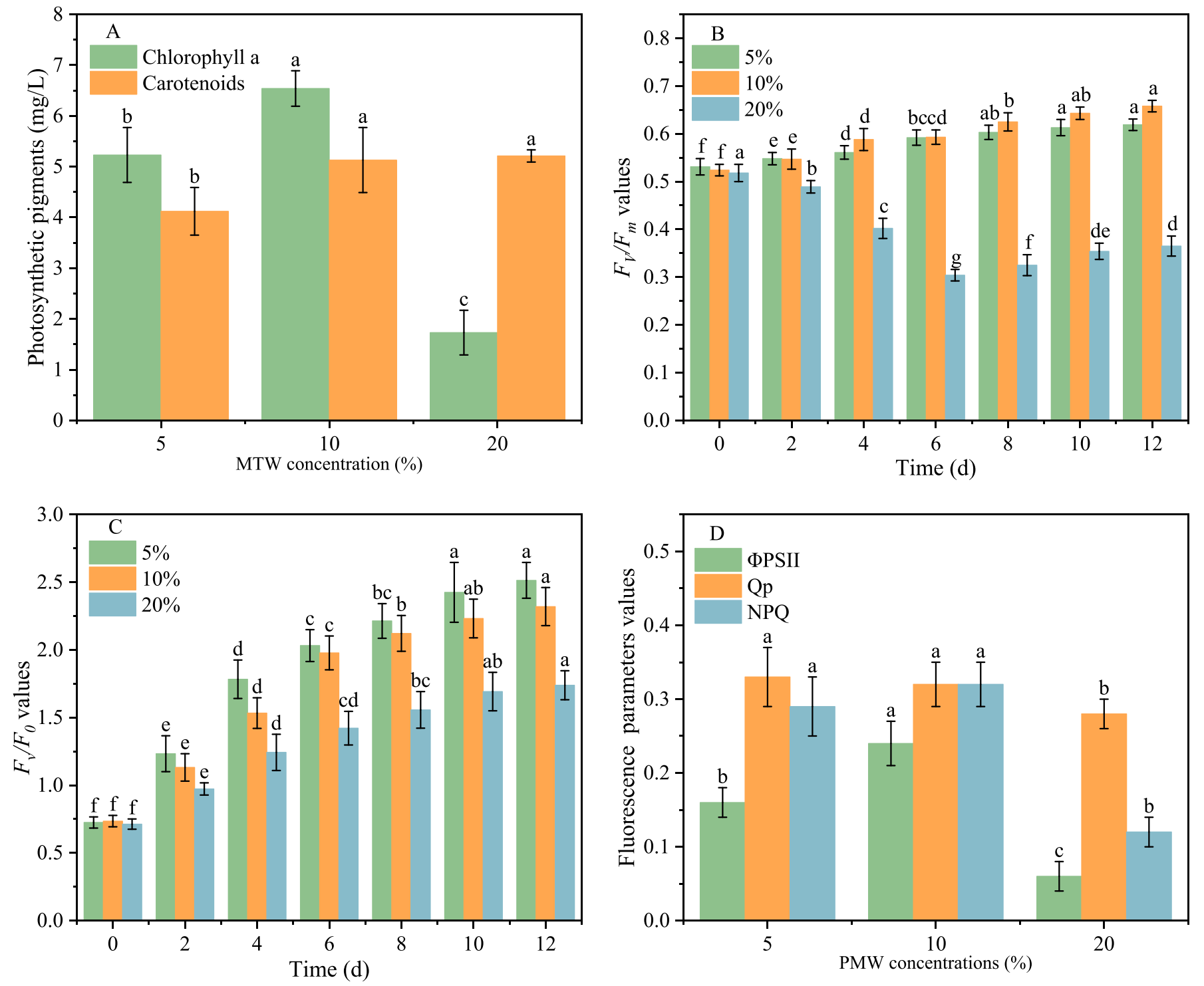 Fv/Fm檢測可以快速評價(jià)微藻對生長環(huán)境的適應(yīng)性。隨著PMW濃度的增加,在圖2B中,在第12天,10% PMW的Fv/Fm最高(0.658)。與未添加PMW相比,5% PMW、10% PMW和20% PMW的Fv/Fm分別降低了8%、2%和46%。這表明藻類的能量轉(zhuǎn)化率降低,對微藻的光合作用有一定的抑制作用。在20%的PMW中,F(xiàn)v/Fm值恢復(fù),表明C. muelleri對不利環(huán)境產(chǎn)生了特異性抗性。Fv/F0可用于確定植物的光合效率和生理狀態(tài)。Fv/F0的下降(圖2C)表明C. muelleri供體側(cè)的水分裂復(fù)合物崩潰,導(dǎo)致電子傳遞能力下降。有效量子產(chǎn)率(ΦPSII)可以揭示微藻在不同環(huán)境條件下的生理狀態(tài)和PSII的性能。5%、10%和20% PMW組C. muelleri的ΦPSII分別為0.16、0.24和0.06(圖2D)??傮w而言,10% PMW處理下C. muelleri的光合效率最好,這也有利于PMW處理。
