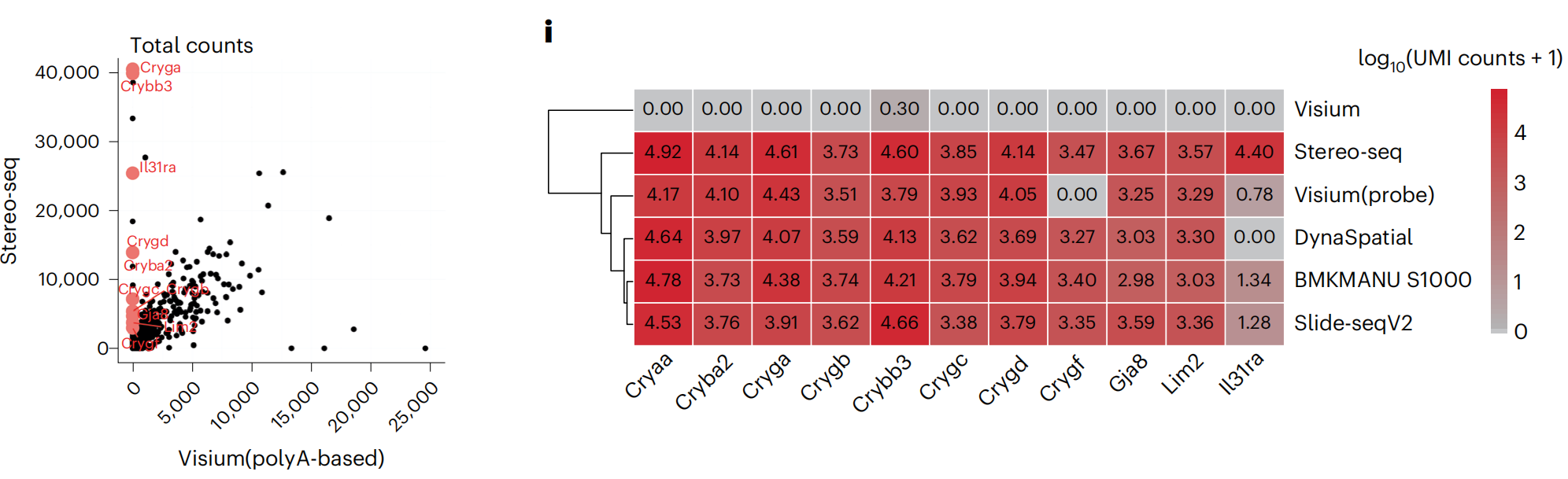 文中對visium(polyA-based)未能捕獲到的基因,在其它技術(shù)平臺中的表現(xiàn)也做了統(tǒng)計,其中BMKMANU S1000、Stereo-seqSlide-seqV2都展現(xiàn)出了統(tǒng)一且全面的基因捕獲性能。