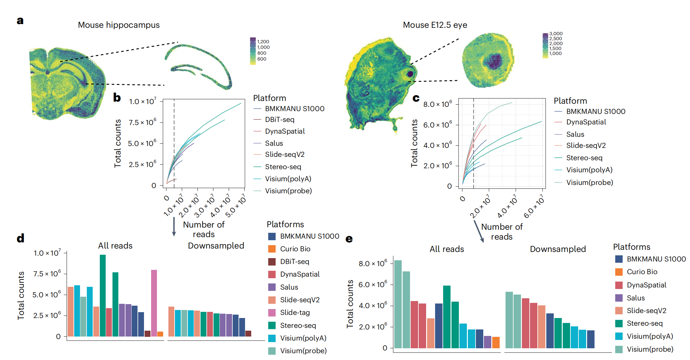 使用11種sST技術(shù),對三種組織進(jìn)行實驗,測序及分析,并對可以實現(xiàn)更高分辨率的BMKMANU S1000、Stereo-seqSlide-seqV2?在細(xì)胞級(10μm)分辨率下進(jìn)一步進(jìn)行了分析。