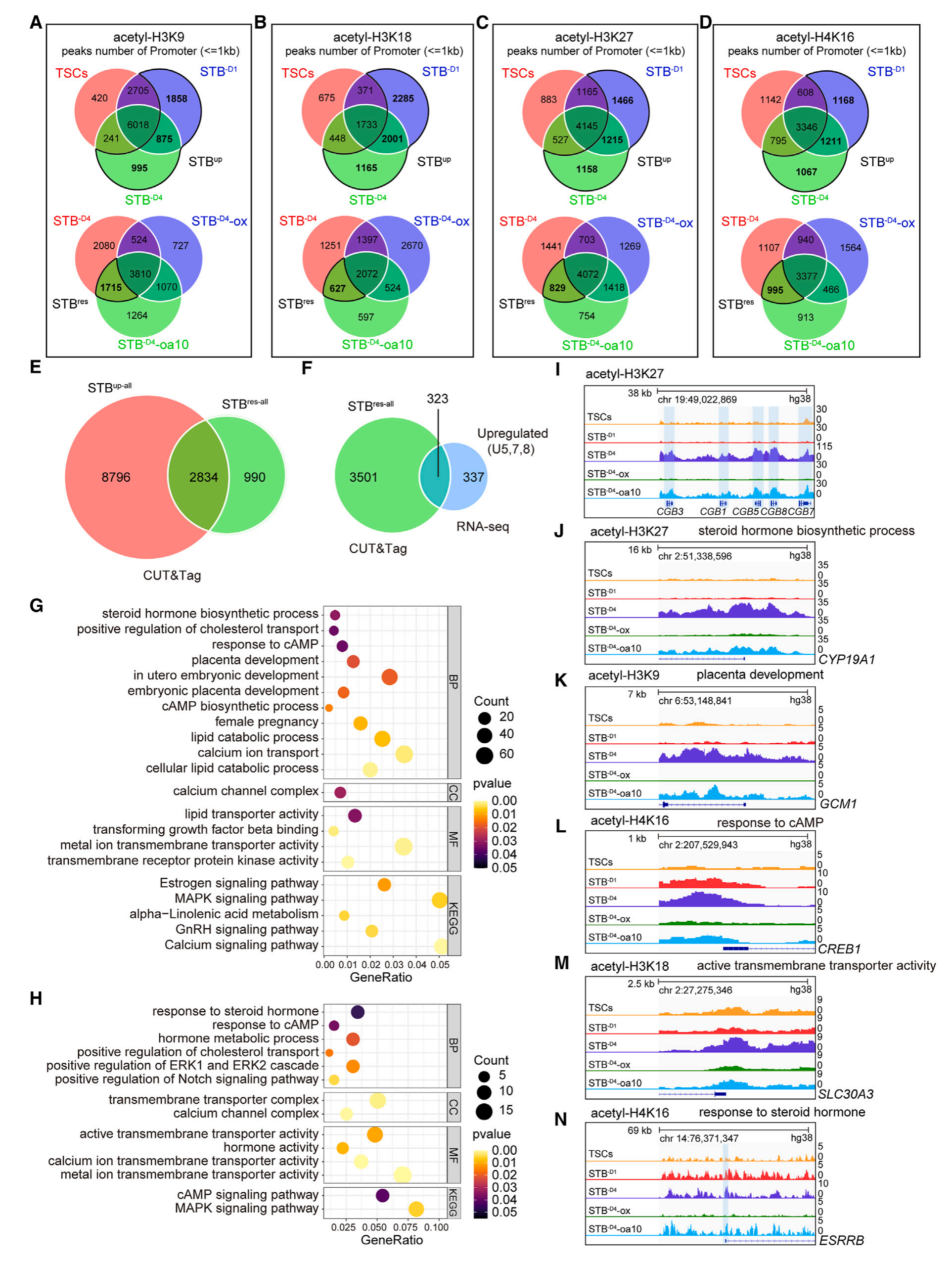 為了研究STBUP-al中哪些基因對合胞至關重要,該研究交叉了STBUP-all和STBres-all數(shù)據(jù)集。確定了2834個基因位點,其中TSS上的這四個組蛋白乙?;稽c都被乙酸拯救并與合胞有關(圖6E),包括眾所周知的合胞標記SDC1、CGB和ERVFRD1(圖6I)。重要的是,已知CGB參與激素合成/分泌,與TSCs和STB-D1相比,在STB-D4中,CGB在其TSS啟動子區(qū)域表現(xiàn)出顯著的乙酰- h3k27(圖6I)。GO和KEGG通路分析顯示,這些基因主要參與有絲分裂控制、合胞起始和STB功能,包括MAPK通路、cAMP通路、胎盤發(fā)育、激素合成/分泌、糖、氨基酸和脂肪酸運輸(圖6G、6J-6L)。其中,已知CYP19A1參與激素合成/分泌,在STB-D4的TSS啟動子區(qū)域顯示顯著的乙酰- h3k27(圖6J)。胎盤發(fā)育的另一個關鍵基因GCM1在STB-D1和STB-D4的TSS啟動子區(qū)域均顯示出顯著的乙酰- h3k9(圖6K)。cAMP應答元件結合蛋白1 (CREB1)參與“cAMP應答元件結合”,在STB-D1和STB-D4的TSS啟動子區(qū)域表現(xiàn)出顯著的乙酰- h4k16(圖6L)。重要的是,草酸處理明顯導致所有這些基因的TSS啟動子區(qū)域組蛋白乙酰化顯著降低,而乙酸補充部分恢復了組蛋白乙?;?/strong>(圖6I-6L)。