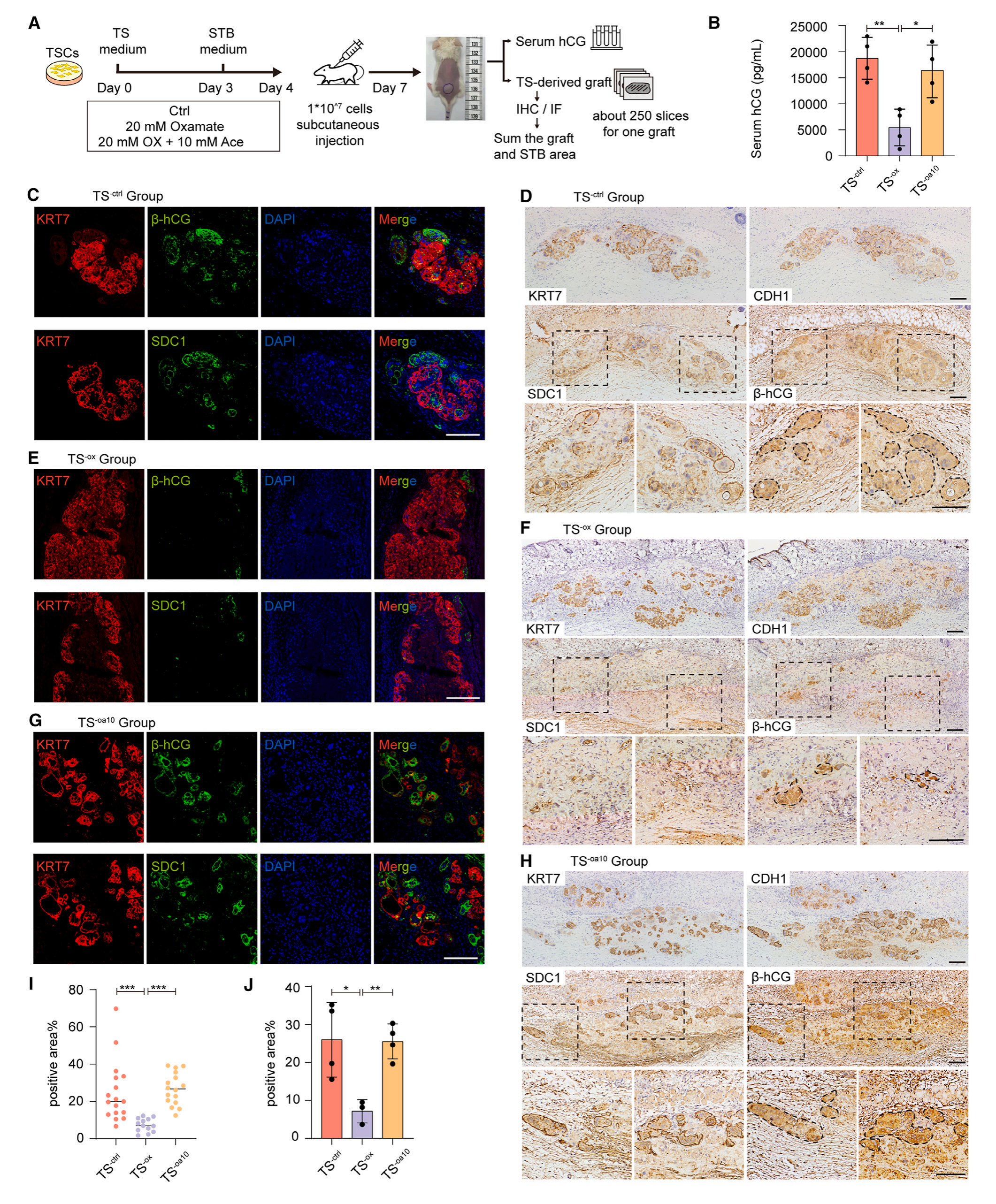 小鼠皮下注射對照hTSCs (TS-ctrl)、氨基甲酸酯處理hTSCs (TS-ox)和氨基甲酸酯和醋酸酯短暫處理hTSCs (TS-oa10)。隨意喂養(yǎng)NOD-SCID小鼠生長7天后,檢測血清hCG,并對移植的滋養(yǎng)細胞進行免疫熒光和免疫組織化學染色,以確定體內滋養(yǎng)細胞的合胞程度(圖7A)。然而,結果顯示STBs分泌到TS-ox小鼠血清中的hCG明顯低于TS – control小鼠(圖7B)。這與靶向數(shù)據(jù)一致,顯示在STB分化的第1天,乙酰輔酶A已經(jīng)開始上升,轉錄和表觀基因組數(shù)據(jù)顯示,STB分化的許多標記已經(jīng)在第1天開始上升。因此,滋養(yǎng)層細胞在分化24小時內就已經(jīng)進入了STB的命運,在滋養(yǎng)層分化的這個時間點干擾糖酵解代謝可能對細胞命運產生不可逆的影響,但不影響細胞活力。