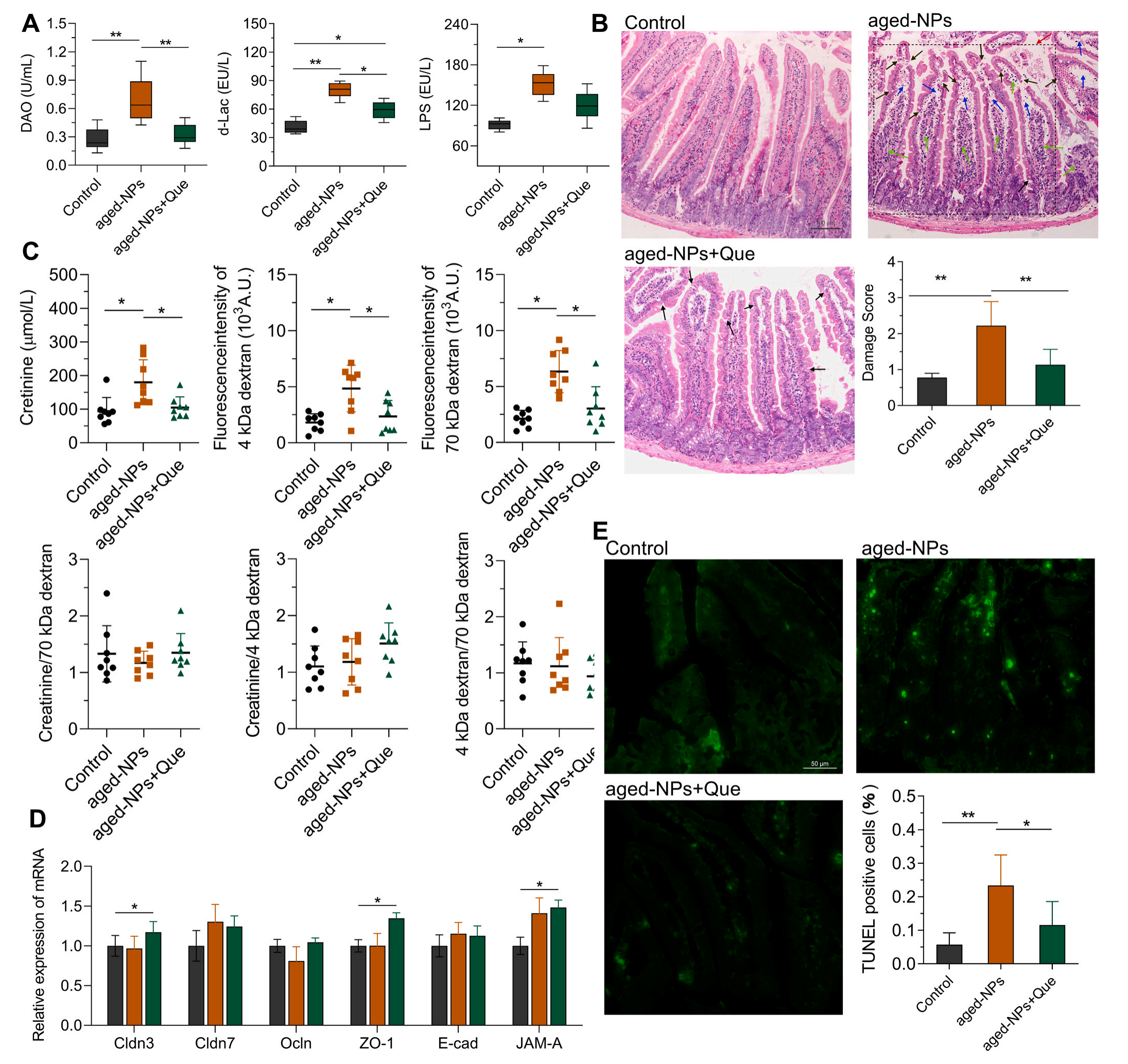 槲皮素 (Que) 占膳食總黃酮類化合物的 60-75%,是一種天然化合物,存在于人類飲食中的各種食物中,包括蔬菜、水果和茶,Que 及其衍生物可以調(diào)節(jié)多個細胞內(nèi)靶標(biāo)和細胞信號傳導(dǎo)過程的能力,具有抗氧化和抗炎分子的作用,探索膳食補充劑 Que 是否可以改善 NPs 誘導(dǎo)的腸道屏障功能障礙具有重要意義。本研究通過轉(zhuǎn)錄組學(xué)、組織病理學(xué)和免疫學(xué)分析探討老化 NPs 暴露下腸道屏障損傷的機制,此外,還評估了 Que 在老化 NPs 暴露下對腸道屏障的積極影響。