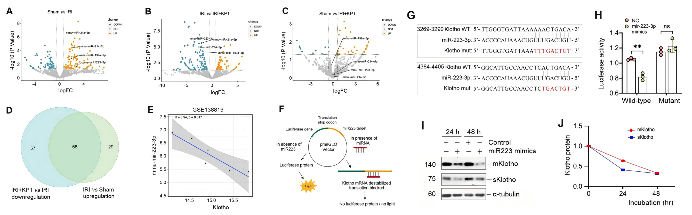 由于 KP1 不影響 Klotho mRNA 水平和蛋白質(zhì)穩(wěn)定性,作者開始探索 KP1 是否通過miRNA調(diào)節(jié) Klotho 蛋白,在 UIRI 腎臟中鑒定到了68個上調(diào)miRNA,在注射 KP1 后恢復到基線,其中 10 個與 Klotho mRNA 的 3′-UTR 特異性結(jié)合,其中miR-223-3p表現(xiàn)非常明顯,且在對公共轉(zhuǎn)錄組數(shù)據(jù)集分析后發(fā)現(xiàn),miR-223-3p 與 Klotho 水平呈負相關,支持了 miR-223-3p 與 Klotho 調(diào)節(jié)的相關性。