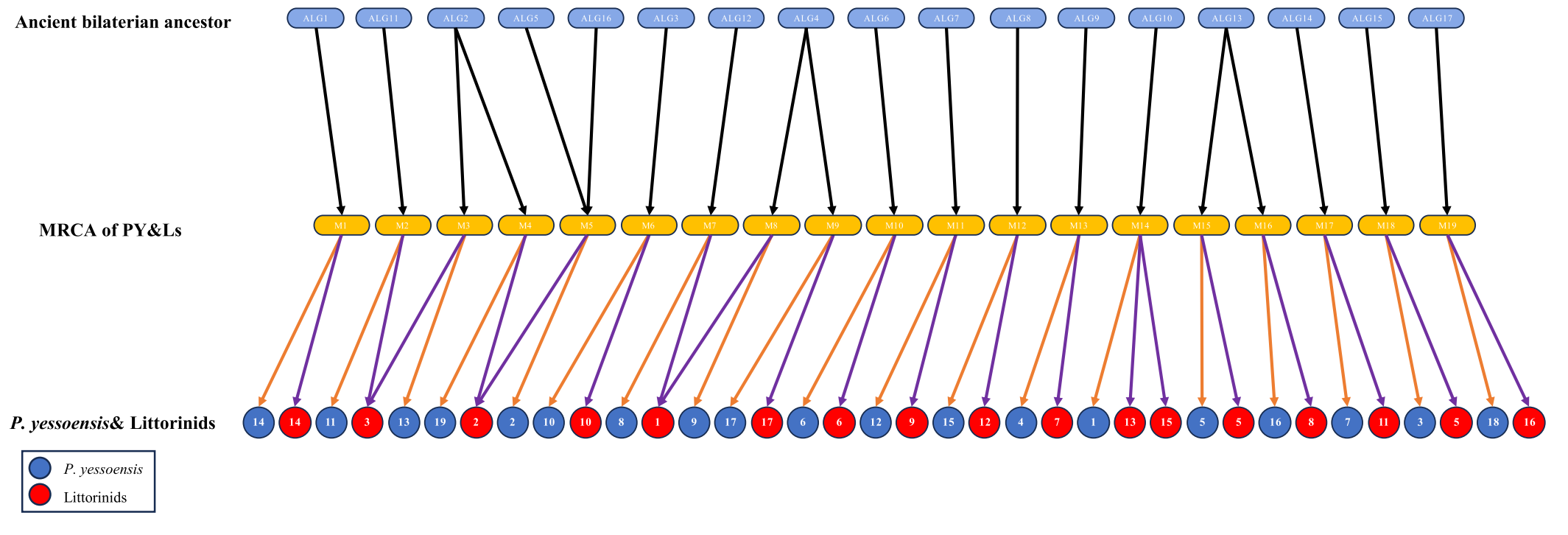 圖3-簡約核型演化歷程推演及濱螺和扇貝共同祖先(MRCA of PY &Ls)核型構(gòu)建