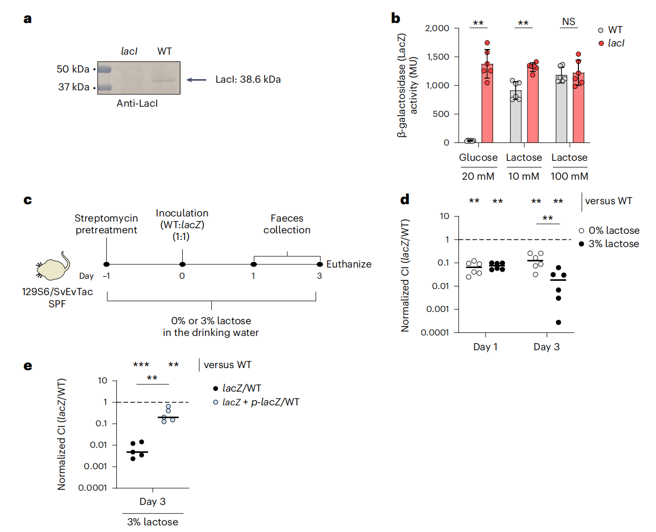 研究人員使用小鼠模型,比較了野生型大腸桿菌 8178 菌株和 lacZ 突變體菌株在富含乳糖條件下的生長情況。結果顯示,野生型菌株的生長速度更快,這表明 lacZYA 操縱子在腸道定植中起著重要作用。lacZYA 操縱子負責乳糖的代謝,野生型菌株能夠更有效地利用乳糖,從而獲得競爭優(yōu)勢。