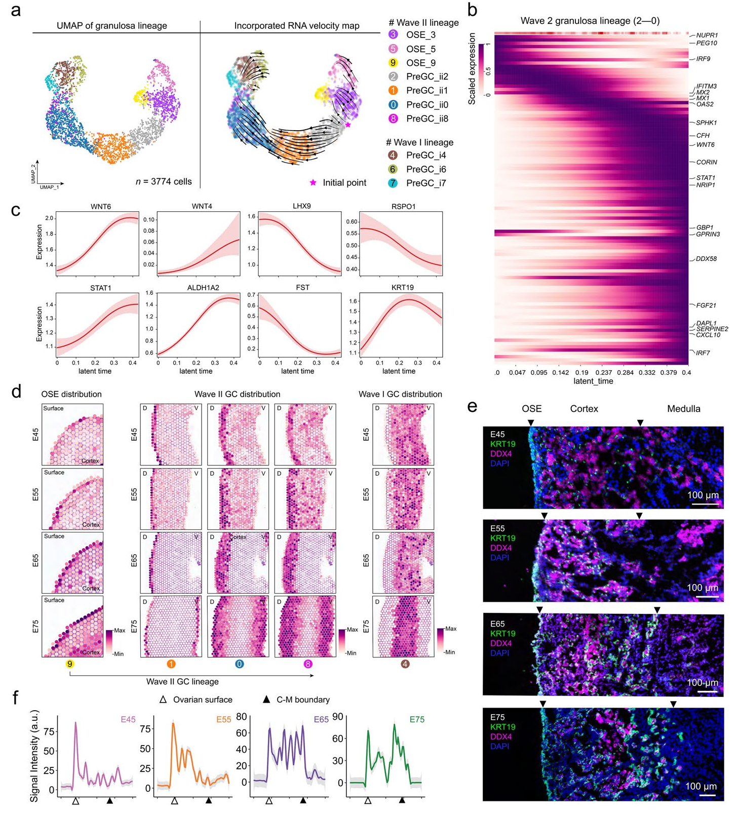 使用空間轉(zhuǎn)錄組學(xué)(ST)技術(shù)對(duì)wave I型顆粒細(xì)胞前體(PreGC_I)和wave II型顆粒細(xì)胞前體(PreGC_II)的標(biāo)志性基因進(jìn)行了空間定位。結(jié)果發(fā)現(xiàn),LHX9(PreGC_I的標(biāo)志)和GREM1(PreGC_II的標(biāo)志)的信號(hào)從E45到E75在卵巢中呈現(xiàn)特定的空間分布模式。在E65和E75,GREM1的信號(hào)明顯環(huán)繞著DDX4(生殖細(xì)胞的標(biāo)志)的信號(hào),表明卵巢卵泡組裝的早期階段,wave II型顆粒細(xì)胞(來(lái)源于皮質(zhì)區(qū)域的顆粒細(xì)胞前體)在卵巢卵泡組裝過(guò)程中發(fā)揮了關(guān)鍵作用。