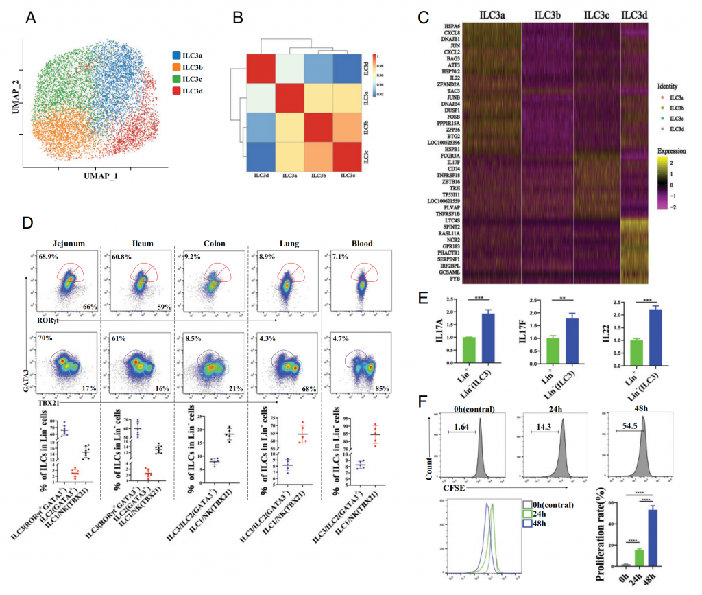 ④ 與小鼠相比,人類和豬腸道ILC轉(zhuǎn)錄上是保守的,一些ILC標(biāo)志基因在人、豬和小鼠中都表達(dá),但豬空腸ILC中也發(fā)現(xiàn)一些特異性表達(dá)基因。人類和豬腸道ILC組成高度相似(主要是ILC3,ILC2幾乎不存在),但小鼠中ILC2占比高。總之,ILC的跨物種數(shù)據(jù)分析和比較,為后續(xù)豬作為人類醫(yī)學(xué)研究模型提供了基礎(chǔ),特別是關(guān)注ILC相關(guān)細(xì)胞和腸粘膜免疫疾病的研究。