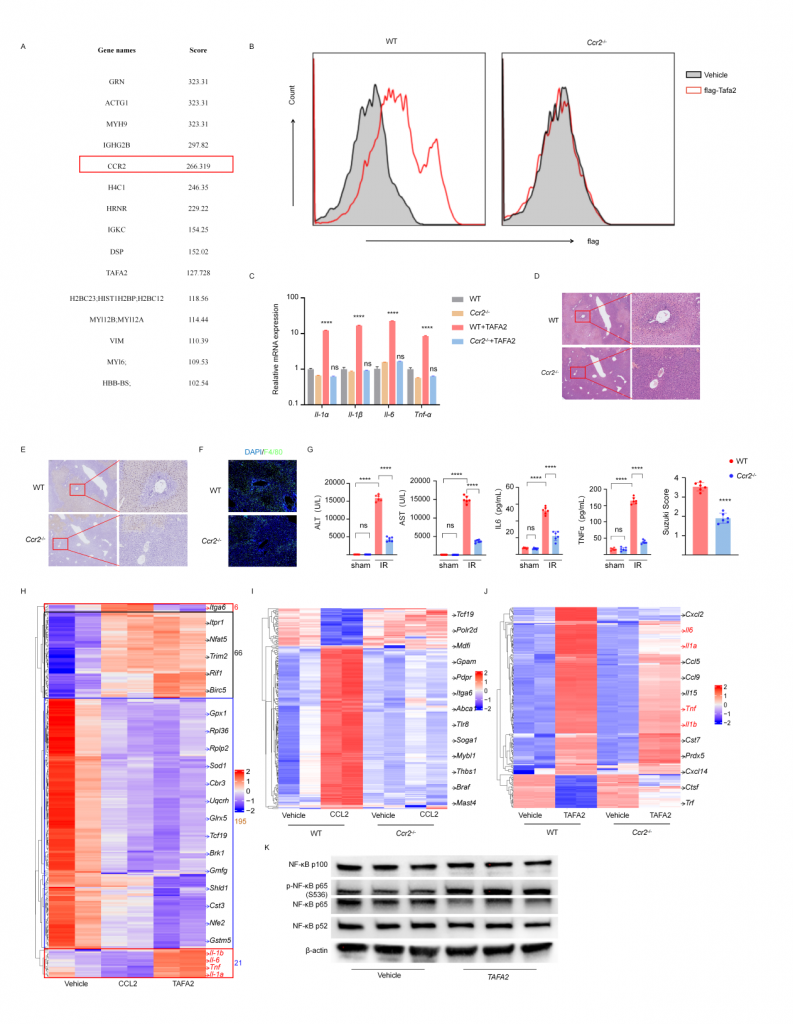 體外實(shí)驗(yàn)表明巨噬細(xì)胞上的CCR2是TAFA2受體,CCR2敲除小鼠IRI肝的組織損傷以及巨噬細(xì)胞浸潤降低,血清標(biāo)志物水平降低。TAFA2或CCL2刺激后BMDM的bulk RNA-seq數(shù)據(jù)表現(xiàn)出幾乎一致的轉(zhuǎn)錄組表達(dá)譜,粘附、代謝、Ras信號通路相關(guān)差異基因表達(dá)上調(diào),代謝和核糖體通路相關(guān)基因表達(dá)下調(diào),TAFA2誘導(dǎo)BMDM更高的表達(dá)Il1α,Il1β,Il6,Tnfα以及干擾素相關(guān)基因,促進(jìn)巨噬細(xì)胞介導(dǎo)的炎癥響應(yīng)。進(jìn)一步實(shí)驗(yàn)表明TAFA2促使巨噬細(xì)胞介導(dǎo)的炎癥響應(yīng)主要依賴CCR2,但巨噬細(xì)胞上也可能存在其他的TAFA2受體。