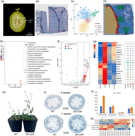 通過對十一個(gè)發(fā)育階段的轉(zhuǎn)錄組學(xué)、代謝組學(xué)、DNA甲基化和空間轉(zhuǎn)錄組學(xué)等多組學(xué)分析,揭示了多個(gè)與次生細(xì)胞生物合成和木質(zhì)素積累相關(guān)的候選基因,例如UGP、MYB308、MYB83、NAC043、NAC073、CCoAOMT1、CCoAOMT7、CHS2、CESA7、LAC7、COBL4和IRX12。在擬南芥(Arabidopsis thaliana)中過表達(dá)JrUGPJrMYB308驗(yàn)證了它們在木質(zhì)素生物合成和細(xì)胞壁加厚中的作用。