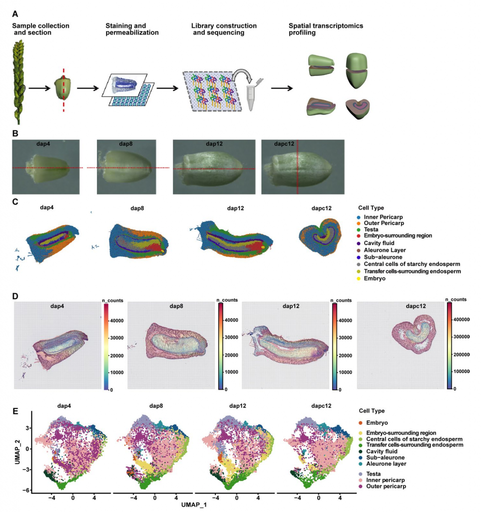 小麥(Triticum aestivum L.)是全球三大主糧作物之一,種植面積約2.3億公頃,其產(chǎn)量提升對保障全球糧食安全與營養(yǎng)供給至關(guān)重要。小麥籽粒主要由三部分組成:二倍體胚、三倍體胚乳及果皮(種皮)。這些組織在發(fā)育過程中表現(xiàn)出顯著的基因表達(dá)時空特異性,形成功能分化的區(qū)室化結(jié)構(gòu)。盡管這些組織在細(xì)胞類型和生理功能上存在明顯差異,但它們通過協(xié)同調(diào)控構(gòu)建了獨特的籽粒發(fā)育微環(huán)境,共同決定籽粒的最終表型。然而,目前對籽粒細(xì)胞類型的認(rèn)知仍主要依賴于形態(tài)學(xué)觀察和少量標(biāo)記基因的表達(dá)分析,常規(guī)轉(zhuǎn)錄組數(shù)據(jù)因缺乏空間分辨率,極大限制了對籽粒發(fā)育調(diào)控機(jī)制的深入解析及關(guān)鍵功能基因的挖掘。