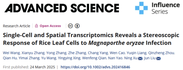2025年3月24日,中國農業(yè)大學植物保護學院劉俊團隊在國際綜合性期刊《Advanced Science》上,在線發(fā)表了題為“Single-Cell and Spatial Transcriptomics Reveals a Stereoscopic Response of Rice Leaf Cells to?Magnaportheoryzae?Infection”的研究長文,該研究利用單細胞核轉錄組測序和空間轉錄組測序技術,深度分析了水稻-稻瘟菌互作下的細胞空間立體響應,并構建了一個全新的水稻-稻瘟菌互作單細胞和時空組轉錄圖譜。