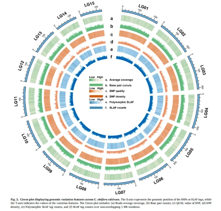 經(jīng)測序,每個樣本平均測序深度為13.95×,共鑒定出470,397個多態(tài)性SLAF標(biāo)簽,并初步檢測到36,317,329個SNP位點,經(jīng)過質(zhì)控過濾后,最終保留了5,685,673個高質(zhì)量SNP供后續(xù)分析。這些SNP廣泛分布于油茶基因組的各個染色體區(qū)域,具有較強的代表性和應(yīng)用潛力,為油茶的遺傳多樣性研究和分子育種提供了寶貴的遺傳資源。 Figure 2展示了SNP位點在各染色體上的分布密度、覆蓋深度和變異質(zhì)量參數(shù),為后續(xù)的遺傳結(jié)構(gòu)分析及品種識別提供了堅實的基礎(chǔ)數(shù)據(jù)支持。