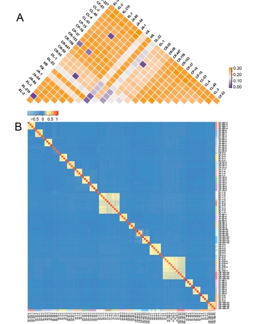 通過計算品種兩兩之間的Fst值與構(gòu)建遺傳距離矩陣,研究進一步明確了油茶品種間的遺傳分化程度和親緣關(guān)系(Figure 5)。Fst值的分析結(jié)果顯示,長林CL-4、達林DL-1與湘林XL-1三者之間的Fst值極低(0.0106–0.0110),這表明這些品種可能源自相同或相似的遺傳背景。類似地,川榮CR-153與湘林XL-3、湘林XL-210之間的Fst值也表現(xiàn)出較高的遺傳相似性(0.0036–0.0442),提示這些品種可能具有共同的祖源關(guān)系。相比之下,達林DL-22與川榮CR-50(0.0816)、川榮CR-55(0.0870)和達林DL-1(0.0759)之間的Fst值較高,顯示出較為顯著的遺傳分化,反映其與這些品種的親緣關(guān)系較為緊密,但仍保持一定的遺傳獨特性。其它品種的Fst值范圍從0.1013到0.2908,表明這些品種的遺傳起源更加多樣,可能涉及不同的地理區(qū)域或品種間的較大差異(Figure 5A)。研究人員進一步使用GCTA軟件計算的G矩陣分析,結(jié)果顯示大多數(shù)油茶品種之間的親緣關(guān)系較為明顯,遺傳分化較大(Figure 5B)。然而,一些品種群體的親緣關(guān)系值相似,例如XL-1、CL-4與DL-1;CR-153、XL-3與XL-210;華碩HS與華鑫HX,表明這些品種可能源自相同或相近的祖先背景。與此不同,達林DL-22品種在其群體內(nèi)部未顯示出顯著的親緣關(guān)系,反映出其群體內(nèi)存在較高的遺傳分化??傮w而言,這些分析為理解油茶品種的遺傳背景和親緣結(jié)構(gòu)提供了重要依據(jù),揭示了不同品種之間的親緣關(guān)系及其遺傳多樣性。