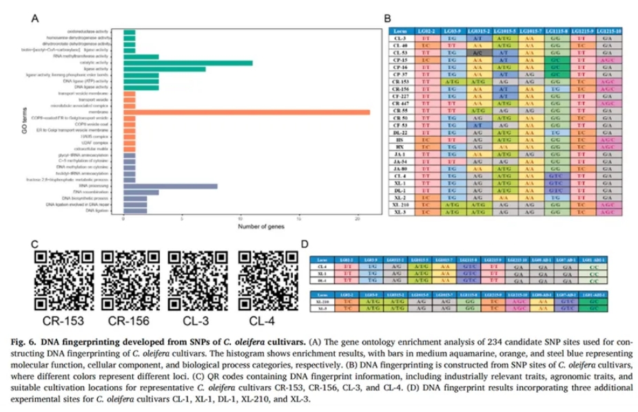 為建立油茶品種的快速鑒定體系,研究人員進一步構(gòu)建了25個主栽油茶品種的DNA指紋圖譜(Figure 6)。在初步獲得的234個候選SNP中,有196個位點被注釋為功能明確的編碼區(qū)域突變,富集于DNA連接、RNA加工、果糖代謝等重要通路(Figure 6A)。為提升區(qū)分效率,進一步篩除掉存在多變異干擾或功能不明的位點,最終篩選得到15個核心SNP位點,可有效區(qū)分全部25個油茶品種,實現(xiàn)穩(wěn)定的遺傳身份標(biāo)識。為確保指紋圖譜的準(zhǔn)確性與應(yīng)用價值,研究通過Sanger測序?qū)?5個候選SNP位點進行了引物驗證,最終篩選出8個多態(tài)性強、峰型清晰的核心SNP位點用于構(gòu)建指紋圖譜(Figure 6B)。這些位點主要分布于功能基因區(qū),涉及次生代謝、胚胎發(fā)育、自噬調(diào)控等關(guān)鍵生物過程,如編碼α-萜品醇合酶的LG12_G02320和控制胚胎發(fā)育與芽形成的FLA8蛋白基因LG03_G02445等,展現(xiàn)出良好的應(yīng)用潛力。為進一步提升指紋信息的實用性,研究人員還開發(fā)了包含8個位點基因型信息的二維碼系統(tǒng),其中涵蓋了油脂品質(zhì)、農(nóng)藝性狀及適宜種植區(qū)域等數(shù)據(jù),為油茶品種的數(shù)字化管理與選育決策提供便捷、高效的技術(shù)支持(Figure 6C)。二維碼系統(tǒng)為油茶品種的數(shù)字化管理與選育決策提供了便捷、高效的技術(shù)支持。通過將分子標(biāo)記信息與油茶生產(chǎn)應(yīng)用相結(jié)合,研究成果不僅實現(xiàn)了分類識別功能,還為分子育種提供了重要參考價值。