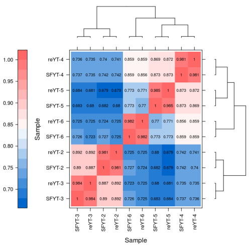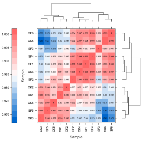 Trans及LncRNA文庫SURFseq 5000及Nova X plus平臺各重復(fù)樣本相關(guān)性統(tǒng)計,整體相關(guān)性在98%以上,數(shù)據(jù)分析結(jié)果與主流平臺結(jié)果一致性較高。