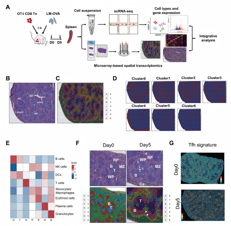 為了研究免疫反應(yīng)過(guò)程中不同免疫細(xì)胞的空間分布和CD8+?T細(xì)胞分化的調(diào)節(jié)機(jī)制,研究人員通過(guò)整合單細(xì)胞RNA測(cè)序(scRNA-seq)和BMKMANU?S1000空間轉(zhuǎn)錄組(ST)技術(shù),分析了急性感染模型中脾臟免疫細(xì)胞的空間分布與CD8??T細(xì)胞分化機(jī)制。實(shí)驗(yàn)采用OT-I轉(zhuǎn)基因小鼠模型,通過(guò)李斯特菌(LM-OVA)感染誘導(dǎo)免疫反應(yīng),關(guān)鍵發(fā)現(xiàn)包括:1)脾臟形成7個(gè)功能集群(B細(xì)胞、T細(xì)胞、單核/巨噬細(xì)胞等);2)感染后T/B細(xì)胞區(qū)擴(kuò)大,APCs(B細(xì)胞、DC、巨噬細(xì)胞)在T細(xì)胞區(qū)外圍聚集;3)空間重組與T細(xì)胞分化(MP/TE亞群)顯著相關(guān)。多組學(xué)整合揭示了免疫微環(huán)境的動(dòng)態(tài)調(diào)控機(jī)制,為理解感染中細(xì)胞互作提供了多組學(xué)視角。