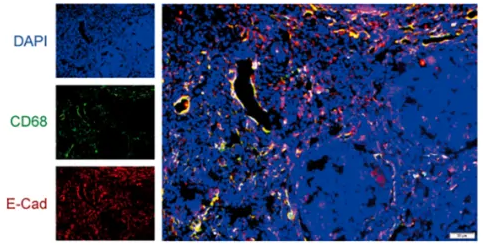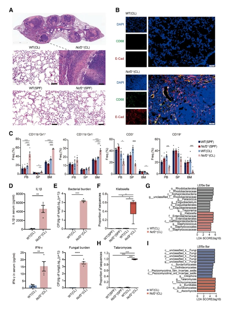 通過不同環(huán)境暴露(SPF或CL)實驗,系統(tǒng)研究了環(huán)境病原體對CGD遺傳背景小鼠表型的影響。表現(xiàn)為HE染色全肺葉顯微圖像可見CL環(huán)境下的Ncf2?/?小鼠肺部出現(xiàn)明顯的肉芽腫結(jié)構(gòu),伴隨炎癥細胞浸潤和組織壞死,其他組小鼠肺部正常。免疫熒光顯示肉芽腫中的巨噬細胞(CD68+)表達上皮標志物E-cadherin,提示巨噬細胞發(fā)生上皮樣轉(zhuǎn)化。通過ELISA法檢測CL?Ncf2?/?小鼠血清中的IL-1β和IFN-γ炎癥相關蛋白水平較CL?WT組增加。16S?rRNA/ITS?測序顯示CL?Ncf2?/?小鼠肺部細菌(如克雷伯菌和葡萄球菌)和真菌(如Talaromyces)負荷顯著增加。