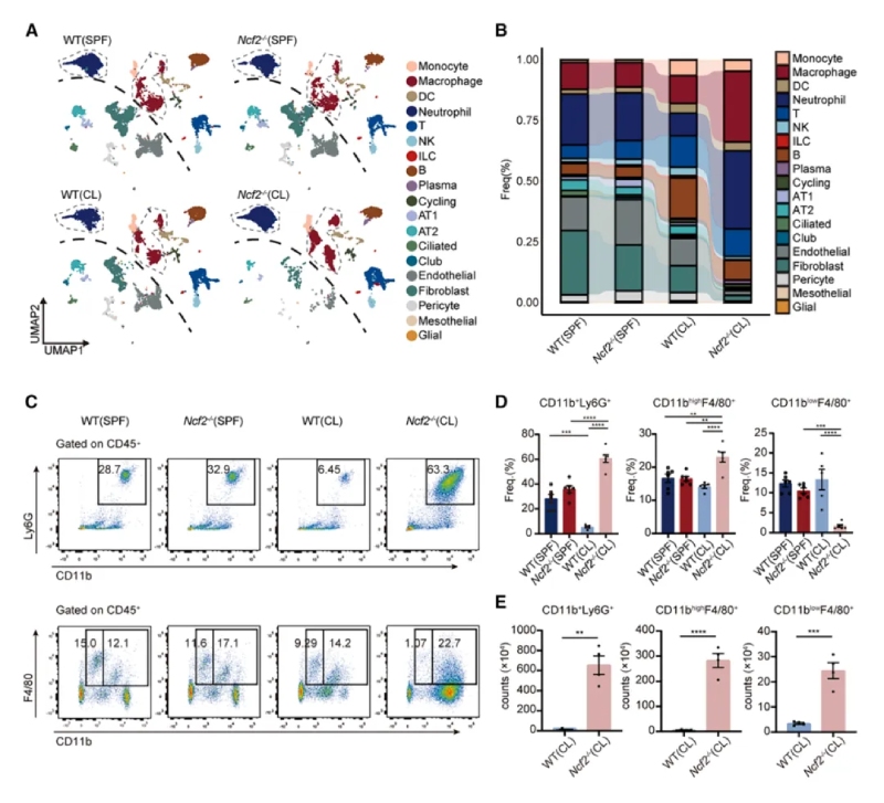 通過單細胞RNA測序和流式細胞術(shù)分析發(fā)現(xiàn)CGD小鼠肺部炎癥微環(huán)境以髓系細胞浸潤為主,提示其參與肉芽腫形成。其中單細胞測序,最終保留了25296個高質(zhì)量細胞樣本,每個細胞平均包含6466條比對讀數(shù)和1972個基因,并識別出9種免疫細胞類型及九種基質(zhì)細胞類型。還發(fā)現(xiàn)一個以細胞周期相關基因(Mki67和Top2a)高表達為特征的細胞簇。通過流式細胞術(shù)分析發(fā)現(xiàn),CL?Ncf2?/?小鼠中CD11b高表達的F4/80+MDMs在比例和絕對數(shù)量上均顯著增加,這些結(jié)果揭示了慢性肉芽腫性葡萄膜炎(CGD)小鼠在肺部感染過程中免疫細胞組成的顯著變化,尤其是中性粒細胞和MDMs的明顯聚集現(xiàn)象。