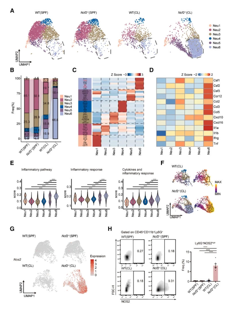 研究顯示,中性粒細胞分為6個亞群,其中Neu6亞群在CL?Ncf2?/?小鼠中顯著擴增且Neu6高表達促炎基因(如Nos2、Mif、Tnf、Il1b)。NO是一種在病原體清除過程中起關鍵作用由NOS2合成的可擴散小分子,CL?Ncf2?/?小鼠肺部的總NO生成量顯著升高。流式驗證顯示CL?Ncf2?/?小鼠肺中NOS2high中性粒細胞比例顯著增加。這些結(jié)果均提示NOS2high中性粒細胞通過產(chǎn)生一氧化氮(NO)和促炎因子,驅(qū)動肉芽腫核心區(qū)的炎癥反應。