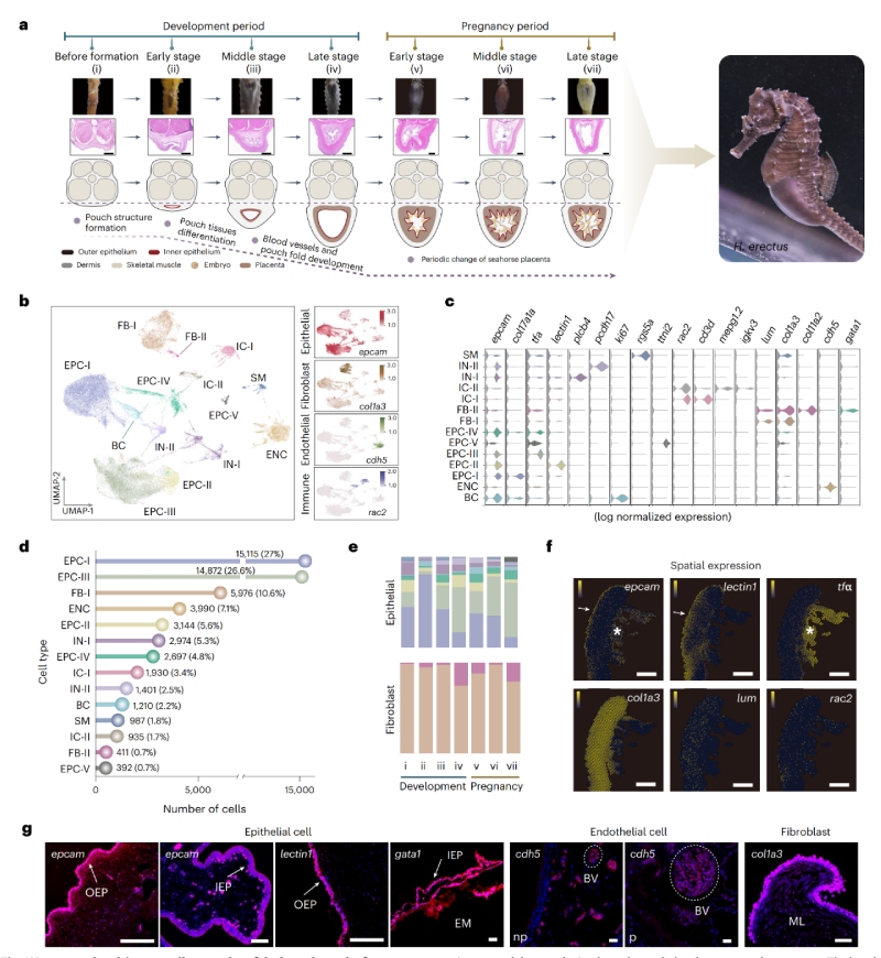 近日,?中國科學(xué)院南海海洋研究所林強(qiáng)研究員團(tuán)隊(duì)聯(lián)合德國康斯坦茨大學(xué)等機(jī)構(gòu)在海龍科魚類“雄性懷孕”的適應(yīng)進(jìn)化與分子調(diào)控機(jī)制取得突破性進(jìn)展,相關(guān)研究成果以?“Cellular?and?molecular?mechanisms?of?seahorse?male?pregnancy”?為題發(fā)表于國際著名期刊Nature?Ecology?&?Evolution。該研究聚焦海龍科魚類中雄性承擔(dān)懷孕職責(zé)的特殊繁殖策略,系統(tǒng)揭示了其育兒袋形成、胚胎營養(yǎng)與免疫保護(hù)等關(guān)鍵生理過程的細(xì)胞和分子基礎(chǔ)。百邁客生物為該研究提供了百創(chuàng)空間轉(zhuǎn)錄組BMKMANU?S1000服務(wù)。