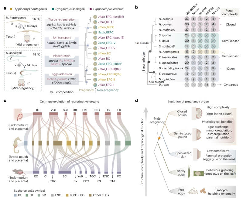 胎生是脊椎動(dòng)物中廣泛存在的一種生殖策略,其特征為受精卵在母體內(nèi)發(fā)育,直至胚胎發(fā)育成熟后才被產(chǎn)出。與這一普遍模式形成鮮明對比的是,海馬科物種演化出了極為特殊的“雄性懷孕”現(xiàn)象,該獨(dú)特的生命史策略為研究動(dòng)物生殖系統(tǒng)的演化提供了重要窗口:功能性相似的生殖方式究竟源于趨同的分子機(jī)制,抑或是通過同源通路或全新的細(xì)胞調(diào)控路徑實(shí)現(xiàn)?盡管已有比較基因組學(xué)研究初步揭示了該生殖方式轉(zhuǎn)變的遺傳背景,然而相關(guān)基因在特定細(xì)胞類型中的表達(dá)模式及其演化軌跡仍不清楚。