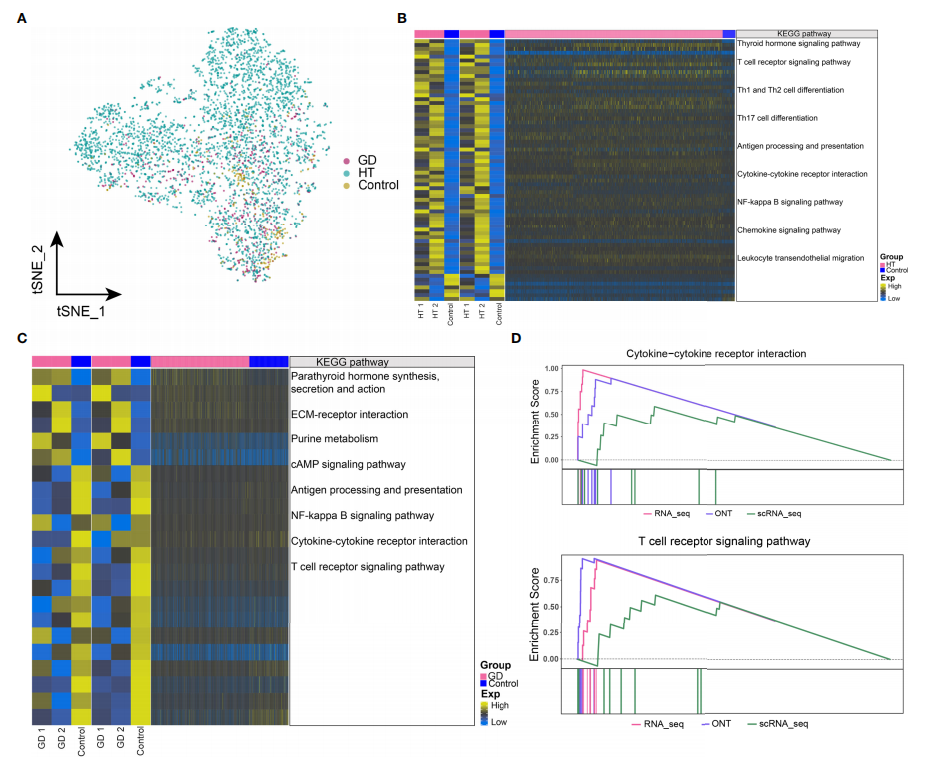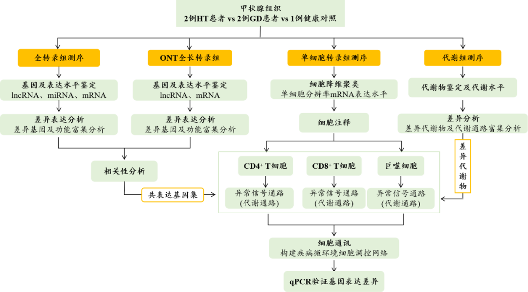 本研究基于HT患者、GD患者和健康對照甲狀腺組織的單細胞RNA測序、全轉錄組測序、ONT全長轉錄組測序和代謝組測序數(shù)據(jù),探討了HT和GD疾病微環(huán)境中基因表達失調(diào)和代謝信號異常的免疫細胞,構建了免疫細胞的全局調(diào)節(jié)網(wǎng)絡,為進一步了解HT和GD免疫紊亂和代謝異常介導的疾病機制、更好地干預和治療疾病提供了科學的理論指導和研究基礎。