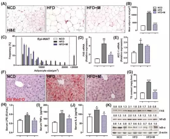 1)?通過比較Epi-WAT脂肪細(xì)胞的大小,發(fā)現(xiàn)HFD組脂肪細(xì)胞顯著增大;而褪黑素通過減少>12000μm2的細(xì)胞數(shù)目,增加2000–8000μm2的細(xì)胞數(shù)目,使HFD+褪黑素組脂肪細(xì)胞大小維持在正常范圍內(nèi),如下圖A-C。