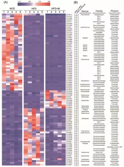 1) ?如下圖顯示,在三個分組中一共找到85個相對豐度有顯著差異的OUT。與NCD組相比,HFD組有27個相對豐度顯著增高的OTU,42個顯著降低的OTU。與HFD組相比,添加了褪黑素的組有10個相對豐度顯著增高的OTU,20個顯著降低的OTU;而在這30個差異性的OTU中,有14個OTU的變化方向與和NCD組比較的結(jié)果完全相反。這14個OTU屬于RuminococcaceaeDesulfovibrionaceae、Bacteroides、PorphyromonadaceaeHelicobacteraceae、Christensenellaceae,有研究表明這些微生物與肥胖相關(guān)